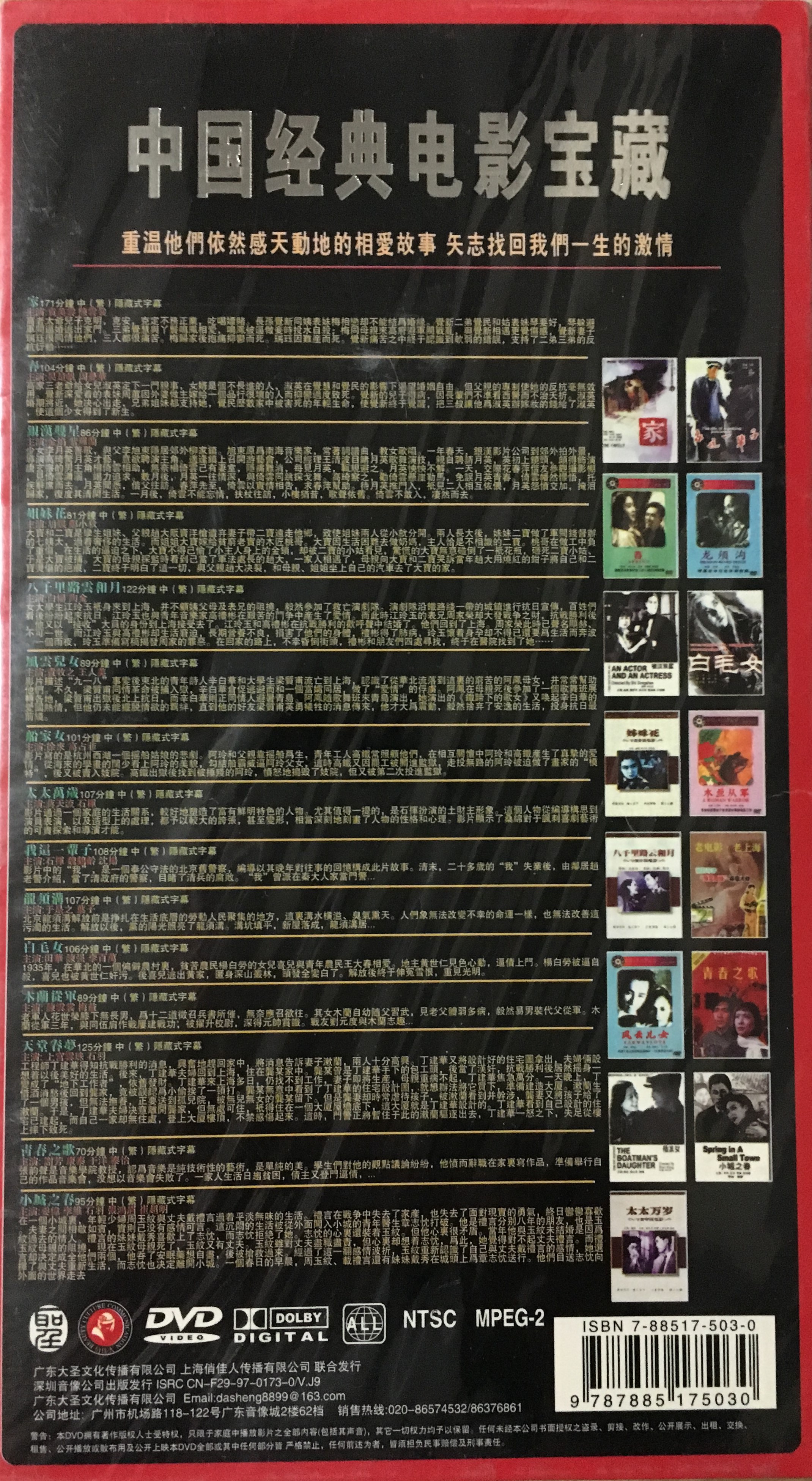 | ● | 100年以上の歴史を持つ中国映画から1950年代までの64作品を選んで4つのDVD包装パッケージ、18枚のディスクにまとめたお買い得品です。 |